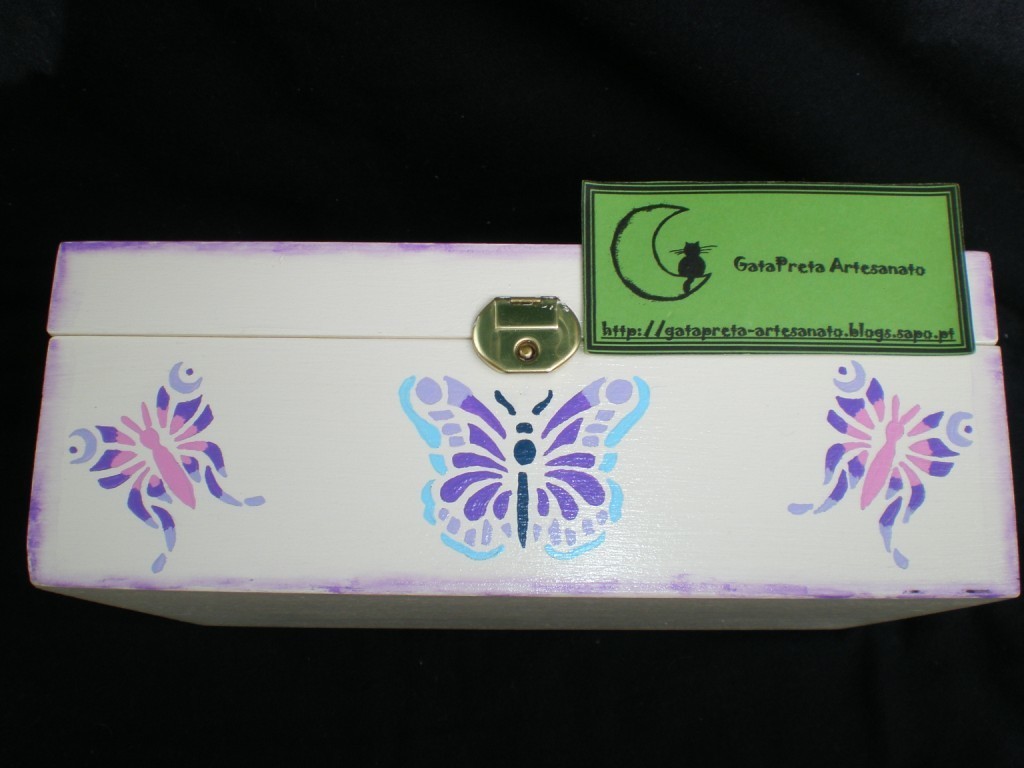 Pormenor da decoração das laterais da caixa: borboletas desenhadas a partir de stencil e pintadas à mão. (Demorei 2.30h a pintar as borboletas todas...).