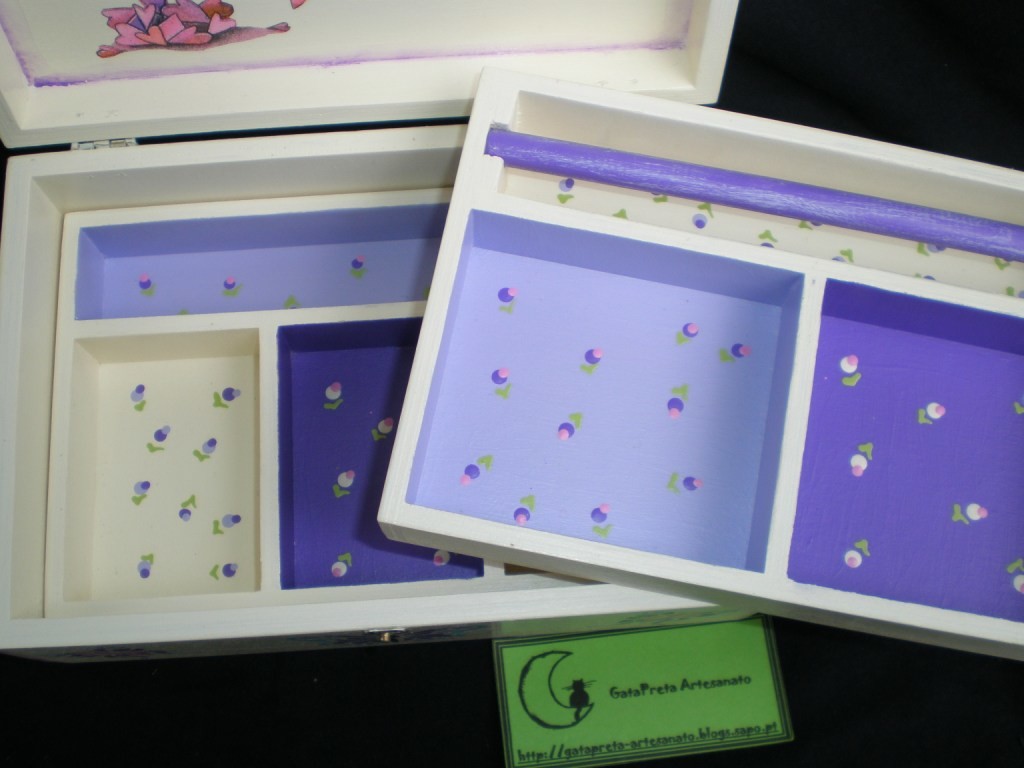 Caixa pintada com tintas acrílicas. Découpage no interior e exterior da caixa.