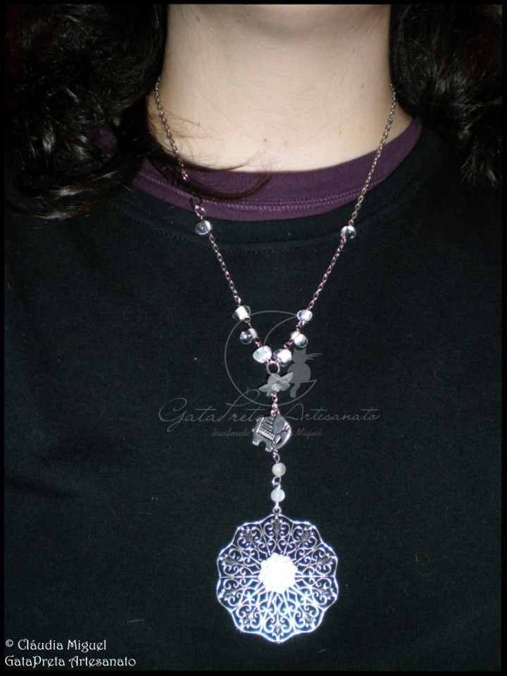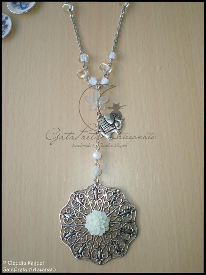 Com flor de resina branca sobre base metálica prateada, contas acrílicas, de vidro e pendente metálico elefante.