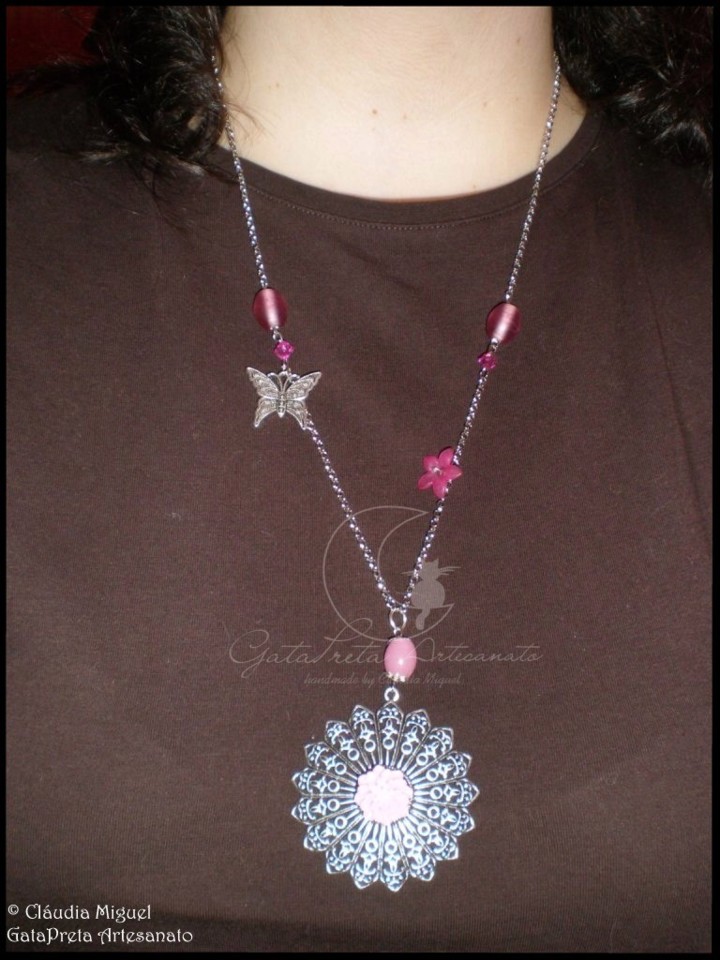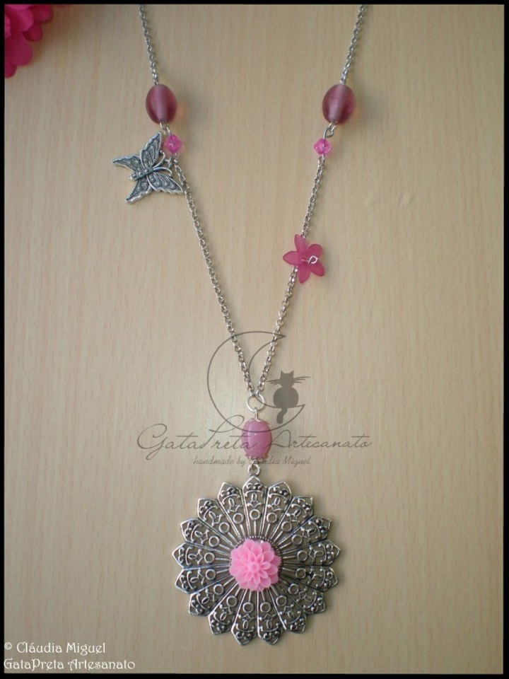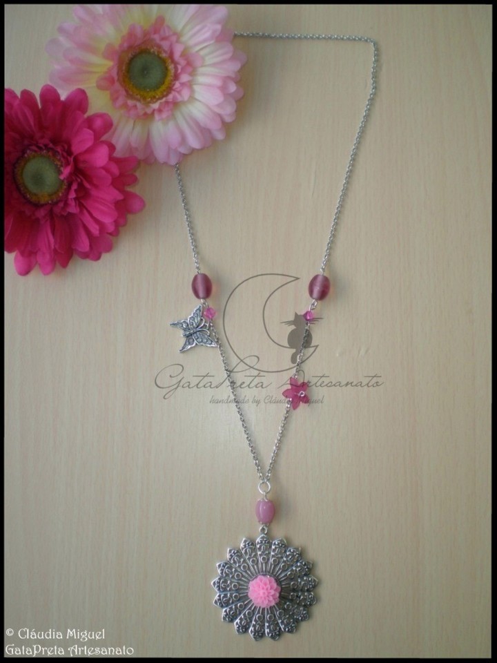 Em tons de rosa, com aplicação de florinha de resina sobre base metálica prateada, contas de vidro, florinha vintage e pendente metálico de borboleta.