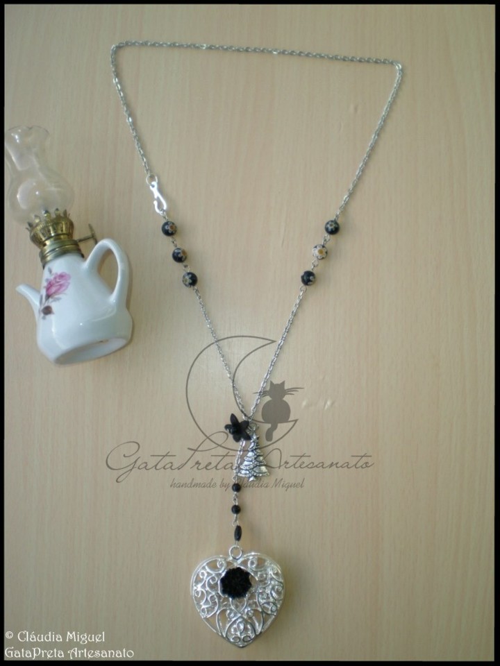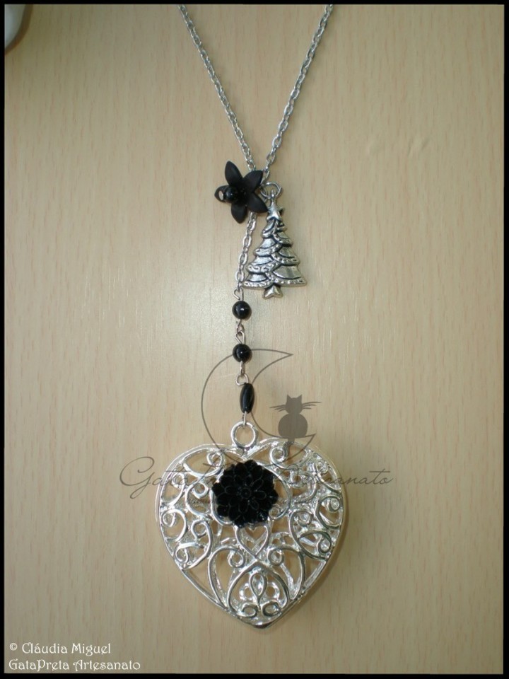 Com flor de resina preta sobre coração metálico prateado, contas de vidro millefiore, florinha vintage e pendente metálico árvore de Natal.