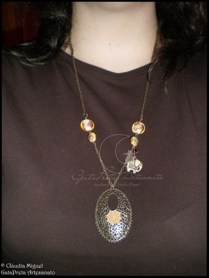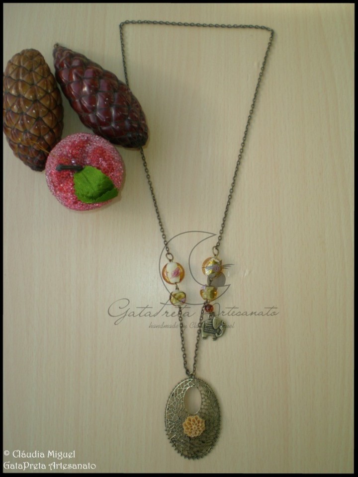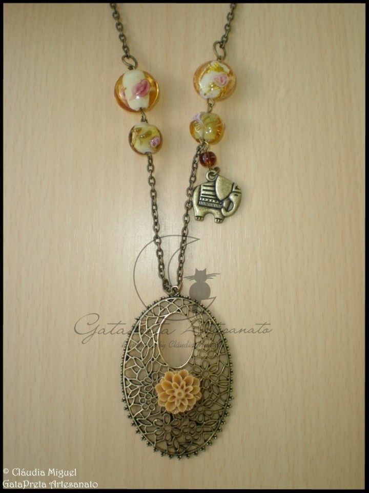 Com flor de resina cor de caramelo sobre base metálica tom de ouro velho, contas de vidro e pendente metálico elefante.