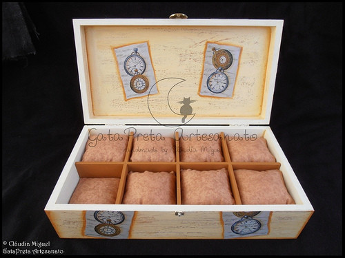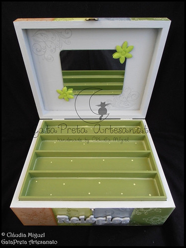 Pormenor do interior da caixa, com as quatro caixinhas para as recordações "O meu cordão umbilical", "A minha pulseira", "O meu 1º caracol" e "O meu 1º dente".