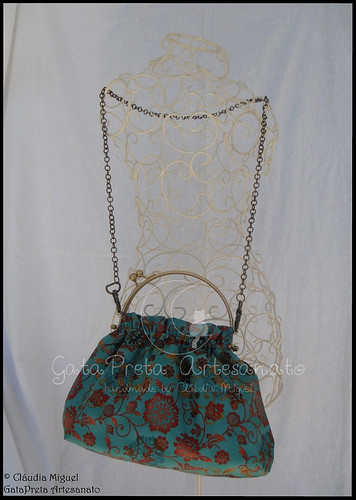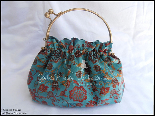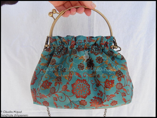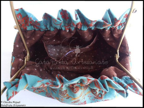 Em tecido azul turquesa com flores a castanho e avermelhado.