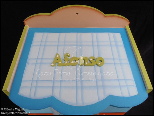 Pormenor da decoração da tampa, com aplicação do nome.