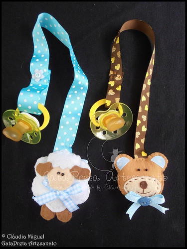 Os dois prendedores de chupetas que acompanharam este conjunto: com a ovelhinha e o ursinho.
