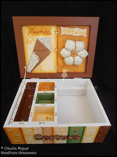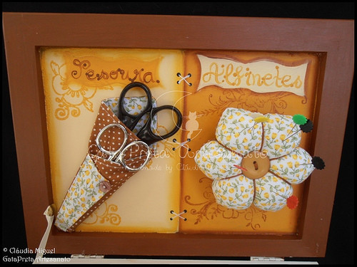 O interior da tampa com aplicação de porta-tesouras e alfineteira.