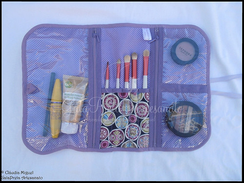 Aqui, recheado com acessórios de maquilhagem.