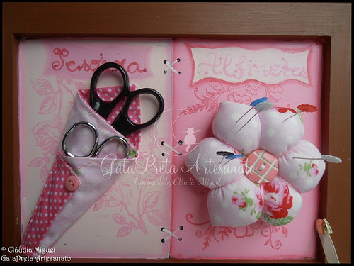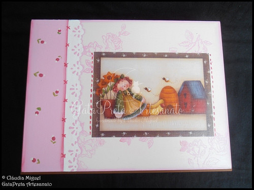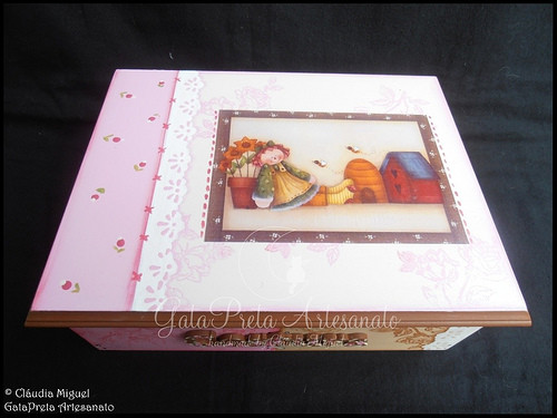 Com aplicação de estampa para découpage, carimbos e imitação de renda.