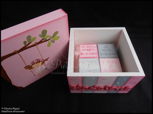 Pormenor do interior com as 4 caixinhas para as seguintes recordações: "O meu cordão umbilical", "A minha pulseira", "O meu 1º caracol" e "O meu 1º dente".