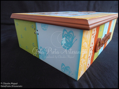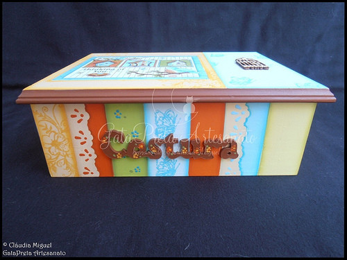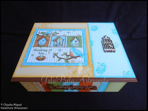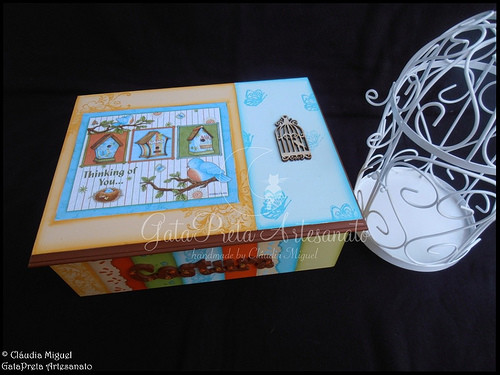 Découpage, aplicação de carimbos e aplicação de pequena gaiola em madeira.