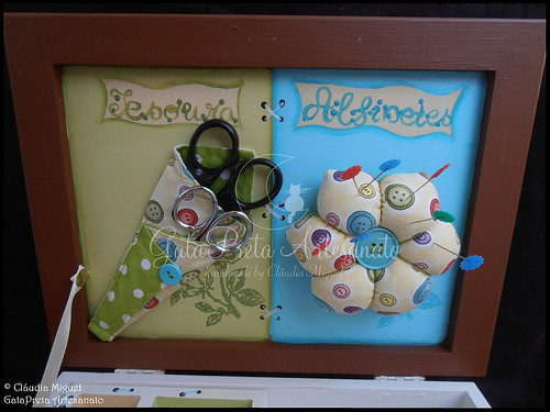 Destaque para a aplicação do porta-tesouras e da alfineteira.