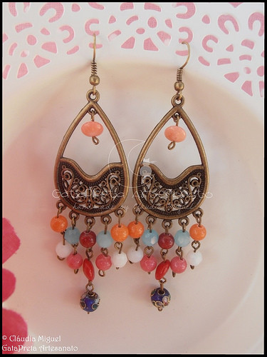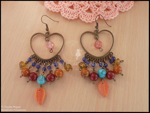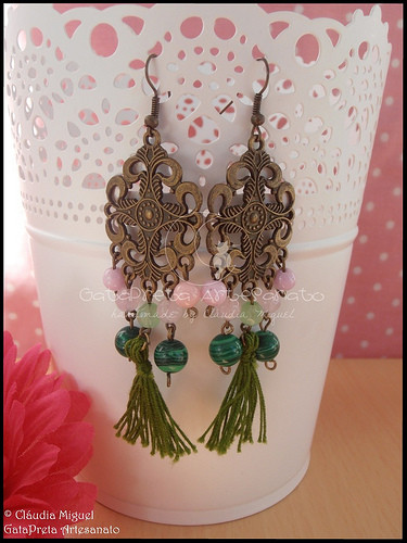 Com contas de metal em bronze, conta de cerâmica, contas de pedra natural e franjinhas de tecido.