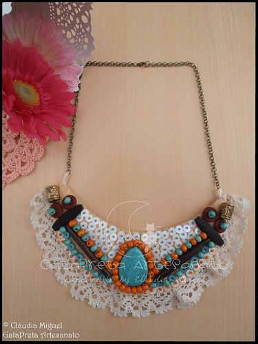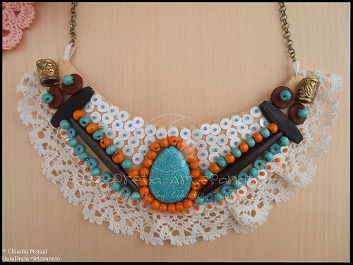 Com lantejoulas, contas de madeira, renda e turquesa ao centro.