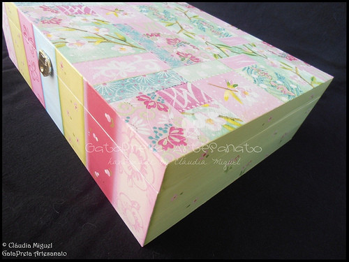 Pormenor da decoração da tampa, com pintura manual, aplicação de carimbos e papel de scrapbooking.