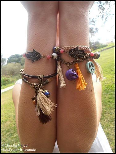 Fios de couro, contas metálicas em bronze, de cerâmica, de pedra natural e franjinhas em tecido.
