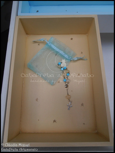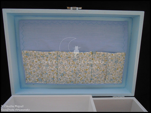 O interior, com as divisões para a vela, toalha e concha de batismo, com espaço para a roupinha por baixo.