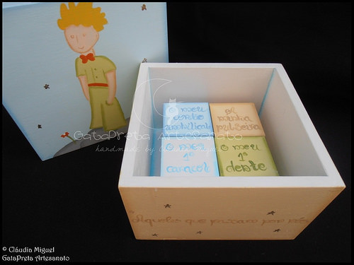 O interior com as 4 caixinhas para as seguintes recordações "O meu cordão umbilical", "A minha pulseira", "O meu 1º caracol" e "O meu 1º dente".