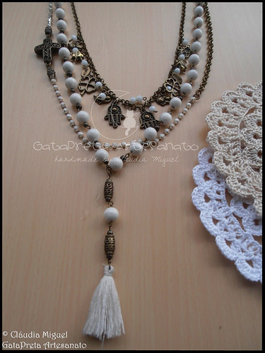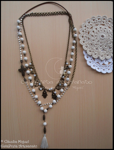 Com contas de pedra natural, correntes, strass, contas metálicas em bronze e franjinha de algodão.