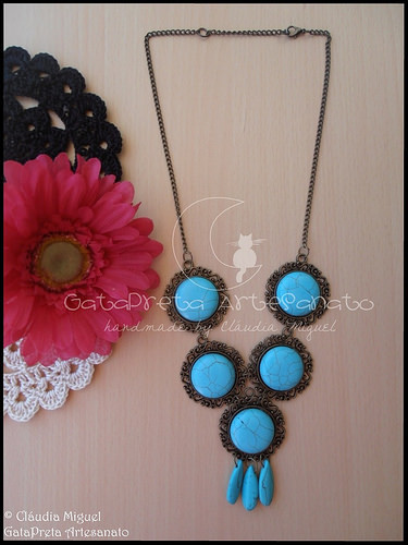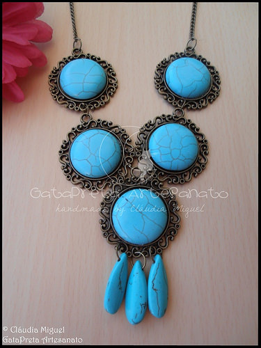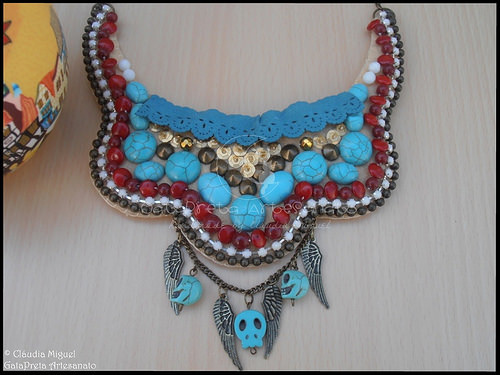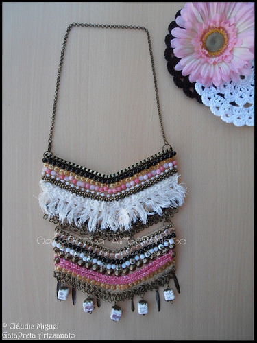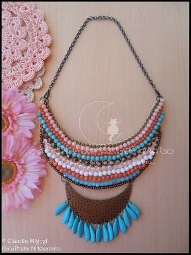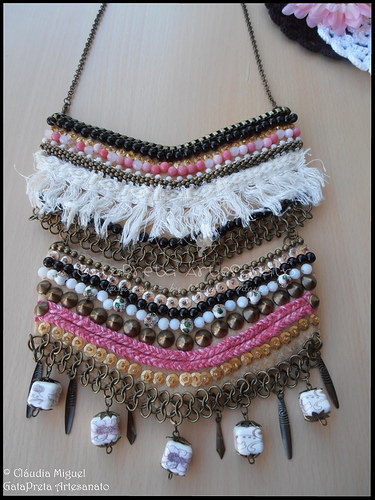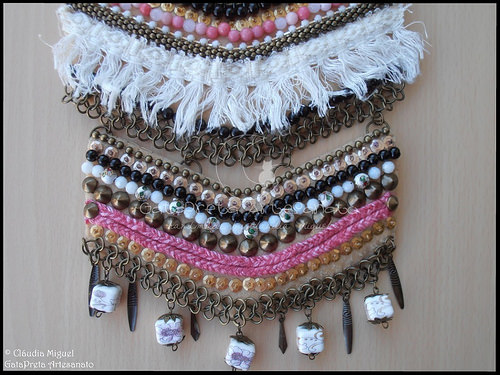 Com contas de pedra natural, de cristal de vidro, acrílicas, correntes de bronze, tachas de bronze, lantejoulas, contas de cerâmica, contas cloisonné e franjinhas de algodão.
