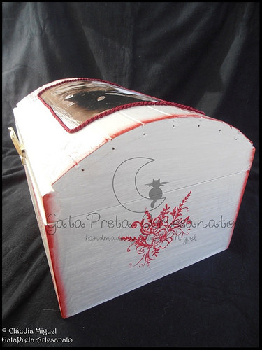 Pormenor da decoração da tampa com aplicação de cordão de seda e carimbos.