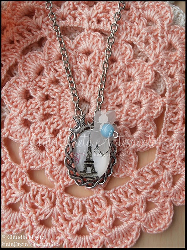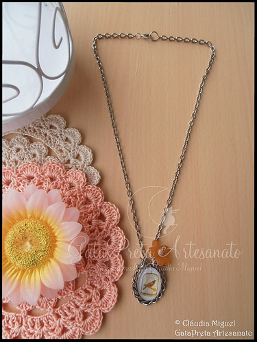Pormenor do pendente metálico com imagem vintage e florinhas,
