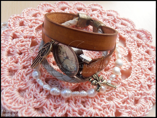 Bracelete em couro camel e em imitação de couro em bege, pérolas de cultura e pendentes em bronze.